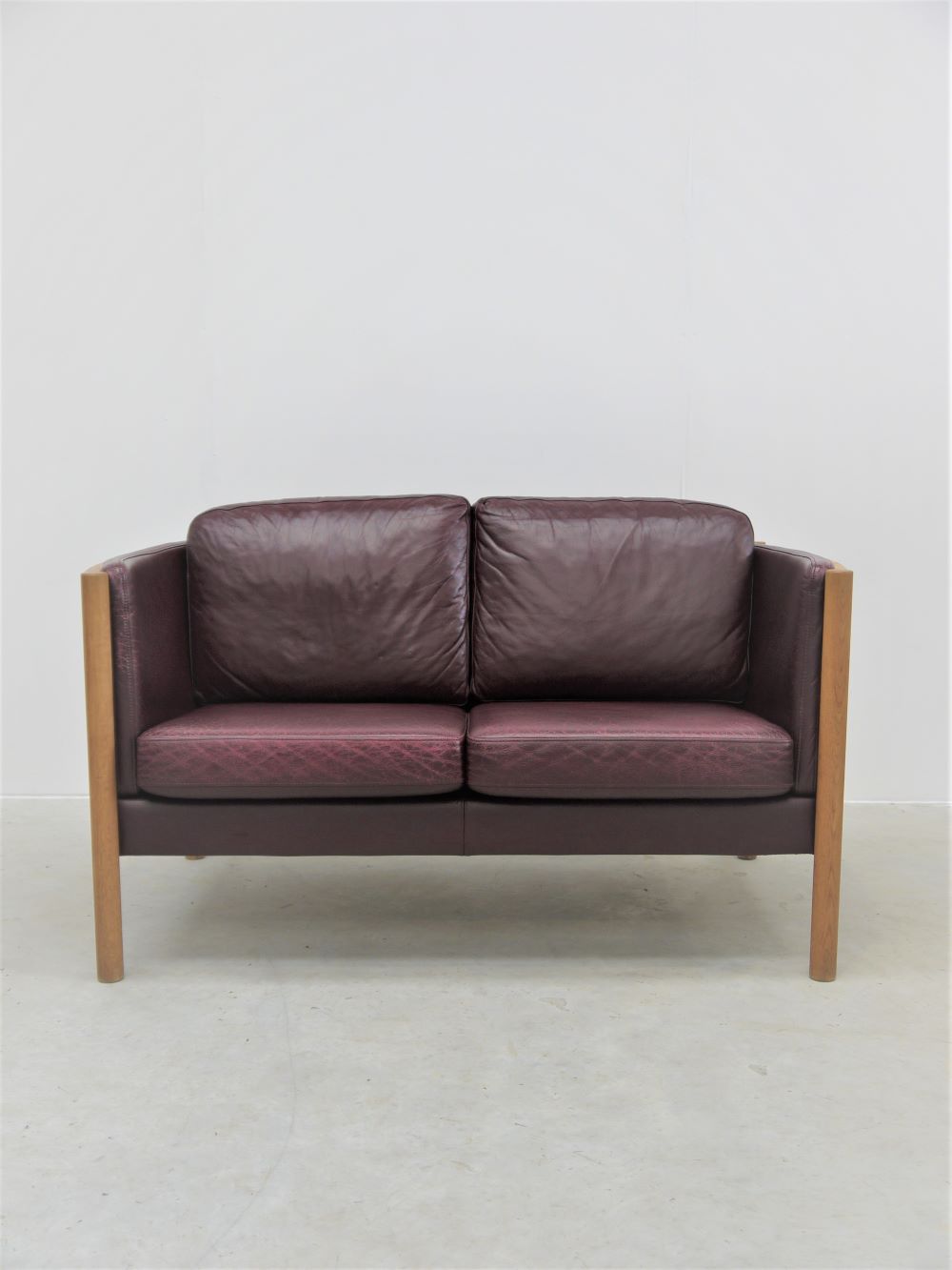 Danish – Oak and Burgundy Leather Two Seat Sofa