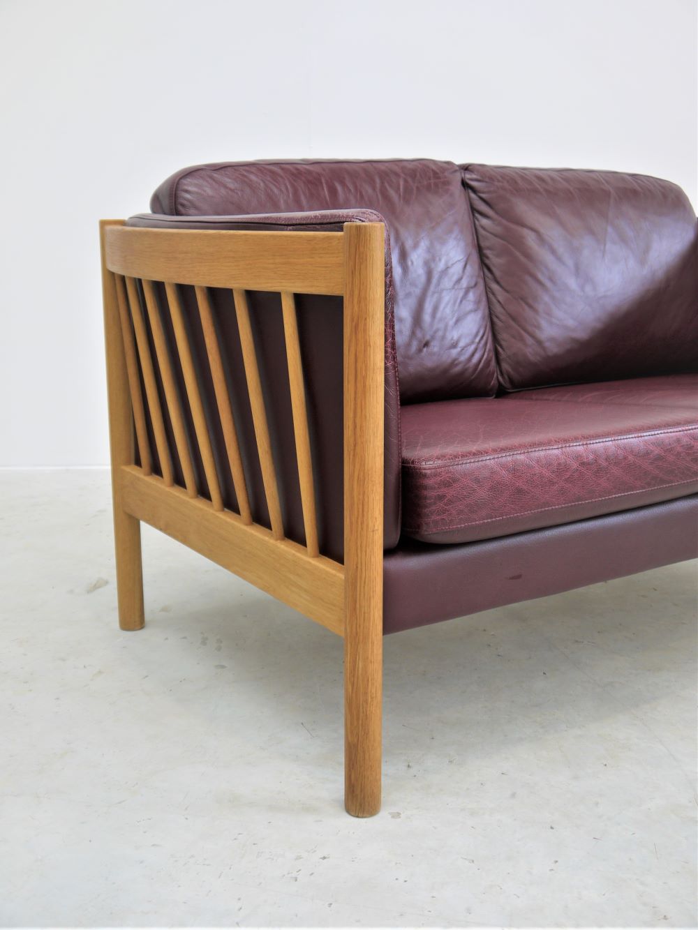 Danish – Oak and Burgundy Leather Two Seat Sofa